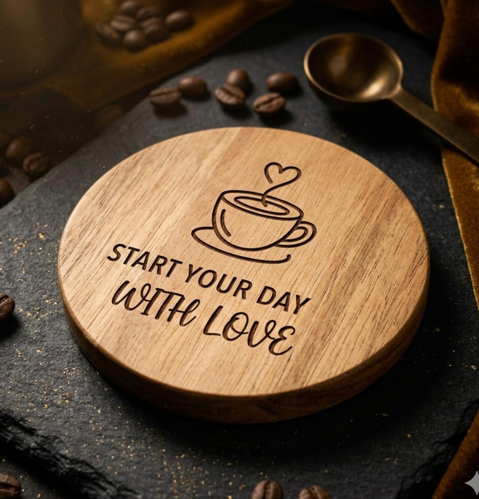 Using high-precision laser technology, we permanently etch your favorite morning mantra, company logo, or family name directly into the wood. The deep, rich burn of the engraving guarantees your custom design will never fade, even under the hottest mugs. It is a thoughtful, everyday keepsake that makes the perfect housewarming gift, corporate giveaway, or a premium upgrade to your own desk.